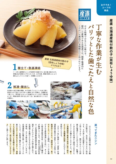おすすめ!コープの商品産直北海道産味付数の子(昆布しょうゆ味)02丁寧な作業が生むパリッとした歯ごたえと自然な色おせち料理でおなじみの数の子。国内一の産地である北海道では、国産・無漂白にこだわった商品が、手間暇かけて作られています。産直北海道産味付数の子(昆布しょうゆ味)ができるまで腹立て・急速凍結1~3月、産卵期のニシンが石狩湾で水揚げされ、加工場に運ばれます。卵巣は生の状態だとやわらかいため、まず冷凍。卵巣が変形しないよう腹を上にしてニシンを並べ、冷凍庫に入れます。解凍・腹出し5月頃から加工作業を開始。まず冷凍していたニシンを水に漬け、空気を入れて泡立てながら均一に解凍します(写真A)。作業場(B)へ移したら、卵を傷つけないよう先端が丸くなった包丁で腹を割き(C)、卵巣を素早く取り出します(D)。身は身欠きニシンなどの原料に。DCAB戻ってきたニシンはじけるような独特の歯ごたえが魅力の数の子。お正月に欠かせない存在です。その多くが外国産ということをご存じですか?数の子はニシンの卵巣を塩漬けにしたものですが、乱獲で1950年代中頃から国内ではほとんどニシンが獲れなくなりました。厳しい漁獲制限や稚魚の放流に取り組み、ようやく漁獲量が回復したのが7~8年前のことです。2017年に発売した「産直北海おおがたあゆむ潟歩道産味付数の子(昆布しょうゆ味)」は、無漂白にこだわり、調味済みで、食べやすくカットした商品。ニシンが水揚げされる厚田漁港にほど近い、ぎょれん総合食品株式会社(北海道小樽市)が製造しています。同社の大社長は「北海道漁業協同組合連合会(北海道ぎょれん)グループの加工場なので、北海道で水揚げされるものを扱うことが使命。カナダ産も扱っていますが、北海道産の比重が高くなってきてうれしいです。石狩湾で獲れるニシンの卵巣は大きくて厚みがありますし、漁師さんが成熟度合いを見極めて水揚げしているので、卵が完熟しているんですよ」と誇らしげに話します。