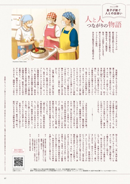 エピソード59息子が紡ぐ人との出会いコープデリグループの組合員数は約550万人。組合員の皆さんの数だけ、物語がある。その物語を毎月一つお届けしていきます。描いているのは皆さんのくらしとコープデリの接点。あなたの物語はどんな物語ですか。みき茨城県で夫と3人の子どもと美さんは、コープの活暮らす月つ動に関わって世界が広がった。きっかけは、よく話をしていた宅配担当者にすすめられ、約2年前に総※1代になったこと。今年7歳の息子さんと一5月には、1緒に、いばらきコープのブ※2ロック委員会が主催するコープデリミールキットの試食会に参加した。息子さんには知的障がいがあり、それまでは「人に迷惑をかけてしまうのでは」と家に閉じこもりがちだった。でも、これからたくさんのことに挑戦してできることを増やしてほしかったし、ブ※3ロック委員からも「ぜひ来てください。私たちも障がいがある方への接し方を学びたいです」と言われ、勇気を出した。会場に着くまで「本当に受け入れてもらえるかな」と不安もあったが、笑顔で迎えてもらえた。息子さんのために、ホットプレートやトングなど使いやすい調理器具まで準備してくれていた。参加者は約15名、和気あいあいと4品の調理と試食を楽しんだ。息子さんは「5種の国産野菜とお米育ち豚の回鍋肉」の調理を担当。野菜などを切る必要がなく、レシピも分かりやすいから、最後までやり切ることができた。調理中も「上手だillustration:MaikoDakeね」「頑張ってるね」とポジティブな言葉を掛けてもらった。自力で料理を作れたこと、それをみんながおいしそうに食べてくれたことが自信になり、夏休みには別のイベントにも参加することができた。………§………3年生まで公立小学校に通っていた息子さんは、集団行動が苦手で、幼稚園の頃から「どうしてできないの」と否定的な言葉を浴びてきた。「よほど辛かったのか、耳に石を詰めたこともありました」と月美さん。でも4年生で特別支援学校に移ると、笑顔で「いいね」「大丈夫だよ」と言ってもらえ前向きになり、見違えるように成長。高等部2年となった今、少しずつ自分の気持ちを言葉にできるようになってきた。「振り返ると、支援学校の先生や組合員の皆さん、たくさんの人に息子が出会わせてくれました。人は一人では生きていけませんね。試食会に参加して、こんなに優しい人たちが身近にいたと知り、今まで私は怖がりすぎていたんだと反省しました」月美さんはコープに加入して年になるが、育児で精一杯で、14総代になるまで活動内容をほぼ知らなかった。「良い食材を販売しているとしか思っていなかったので、幅広い活動を知って驚きました」と明かす。3月からはブロック委員となり、新たな出会いや学びを楽しんでいる今、月美さんがお守りにしている言葉がある。“食べるしあわせ、自分らしいくらし「ともに」の力で、笑顔の明あし日たを”というコープデリグループのビジョン2035だ。「息子を他の子と同じように育てなければ、と肩に力が入っていた私には、多様性を肯定してくれる応援メッセージです。それに、嫌なことがあってもおいしいものを食べると元気になれますよね」と笑う月美さん。今後は、ブロック委員として障がい者や不登校の子などに向けた食のイベントを企画し、未来ある子どもたちの背中を押していきたいと考えている。※1※2※3組合員の代表。「総代会」で生協の事業計画や予算などについて審議・議決する地域でさまざまな活動をサポートするコーディネーター役を担う組合員の集まり。地域により名称は異なります※2を担う組合員過去の物語もこちらから読めますあなたのエピソードをお寄せください。コープ職員との心に残る出来事を随時募集しています。氏名・電話番号・組合員コードを記入し、郵便(〒336-8526埼玉県さいたま市南区根岸1-4-13コープデリ連合会コミュニケーション推進部宛)か、左記のWeb応募フォームよりお送りください。♦実際にあったコープに関わる人と人との交流を取材し、読み物の形にまとめています。登場する人物の名前は仮名の場合があります。イラストはイメージです。07