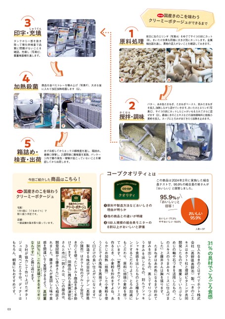 印字・充じゅうてん填タンクから一部を抜き取って理化学検査で品質に問題がないことを確認。充填し(写真E)、重量検査機を通します。E国産きのこを味わうクリーミーポタージュができるまで原料処理前日に生のエリンギ(写真A)をゆでてサイコロ状にカット(B)。まいたけ水煮も同様に大きさ別にカットします。金属検出器を通し、異物の混入がないことを確認しておきます。加熱殺菌商品を並べたトレーを積み上げ(写真F)、大きな釜に入れて加圧加熱殺菌します(G)。BAGFかくはん拌・調味攪バター、あめ色たまねぎ、たまねぎペースト、刻みたまねぎを投入、加熱しながら混ぜていきます。まいたけとエリンギ(写真C)、サイコロ状にカットしたじゃがいもを入れてさらに混ぜます(D)。最後にきのこエキスなどの液体調味料と焙焼小麦粉を投入。スープにとろみが出てきたら加熱を止めます。箱詰め・検査・出荷水で冷却してからエックス線検査を通し、箱詰め。倉庫に保管し、2週間後に菌検査を実施、パッケージ内で菌の発生・増殖が起こっていないことを確認してから出荷します。DC今回ご紹介した商品はこちら!コープクオリティとはこの商品は2024年2月に実施した組合員テストで、95.9%の組合員の皆さんが「おいしい」と回答しました。国産きのこを味わうクリーミーポタージュ宅配:1月1回に『ぐるめぐり』で取り扱う予定です。店舗:一部店舗を除き取り扱っています。❶原料や製造方法などおいしさの理由が明らか❷他の商品との違いが明確❸100人規模の組合員モニターの8割以上がおいしいと評価95.9%が「おいしい」と回答!おいしい77.3%ややおいしい18.6%人数=9731%の具材でごろごろ食感仕入れるきのこはすべてホクト株式会社(長野県長野市)製。「きのこエキスはホクト社と理研ビタミンが共同開発したもので、廃棄していたぶなしめじの軸や石づきを活用したもの。このエキスのうまみをベースに仕上げました」と藤井さんは胸を張ります。たまねぎはあめ色になるまで炒めて甘みを出したもの、蒸してすりつぶしうまみを出したもの、刻んでシャキシャキ食感を出したものと3種をブレンドするこだわりよう。とろみ加減にもこだわり、原料に焙ばいしょう焼小麦粉を使っています。「家庭でホワイトソースを作るとき、小麦粉を炒めますよね。あらかじめ加熱(焙焼)した小麦粉を使うことでその風味を再現でき、香ばしく口どけの良い仕上がりになります」製造する株式会社アーデン(長野県川一則さんは、「この商品は、小諸市)はホクト社のグループ会社で、きのこを使ったレトルト商品を多く手掛けています。同商品に携わる美みさいづてつや齊津哲也さんと市いちかわかずのり開発段階から藤井さんにいろいろ相談されました。藤井さんが意図した味や食感を間違いなく実現できるよう、具材量1%に。これは充じゅうてん填できるギリギリは3なんです」と振り返ります。3社が協力して作り上げたポタージュは、食べごたえ十分。ディナーはもちろん、朝食にもおすすめです。03