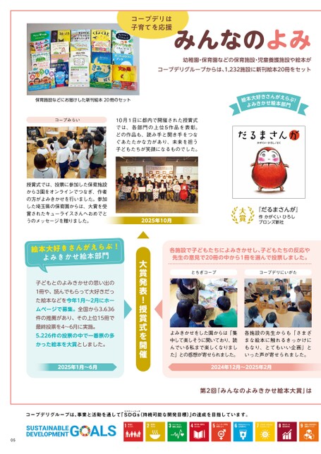 コープデリは子育てを応援みんなのよみ幼稚園・保育園などの保育施設・児童養護施設や絵本がコープデリグループからは、1,232施設に新刊絵本20冊をセット保育施設などにお届けした新刊絵本20冊のセット絵本大好きさんがえらぶ!よみきかせ絵本部門コープみらい10月1日に都内で開催された授賞式では、各部門の上位5作品を表彰。どの作品も、読み手と聞き手をつなぐあたたかな力があり、未来を担う子どもたちが笑顔になるものでした。2025年10月『だるまさんが』作かがくいひろしブロンズ新社各施設で子どもたちによみきかせし、子どもたちの反応や先生の意見で20冊の中から1冊を選んで投票しました。とちぎコープコープデリにいがたよみきかせをした園からは「集中して楽しそうに聞いており、読んでいる私まで楽しくなりました」との感想が寄せられました。各施設の先生からも「さまざまな絵本に触れるきっかけにもなり、とてもいい企画」といった声が寄せられました。大賞発表!授賞式を開催授賞式では、投票に参加した保育施設から3園をオンラインでつなぎ、作者の方がよみきかせを行いました。参加した埼玉県の保育園からは、大賞を受賞されたキューライスさんへおめでとうのメッセージを贈りました。絵本大好きさんがえらぶ!よみきかせ絵本部門子どもとのよみきかせの思い出の1冊や、読んでもらって大好きだった絵本などを今年1月~2月にホームページで募集。全国から3,636件の推薦があり、その上位15冊で最終投票を4~6月に実施。5,226件の投票の中で一番票の多かった絵本を大賞としました。2025年1月~6月2024年12月~2025年2月第2回「みんなのよみきかせ絵本大賞」はコープデリグループは、事業と活動を通して「SエスディージーズDGs(持続可能な開発目標)」の達成を目指しています。05