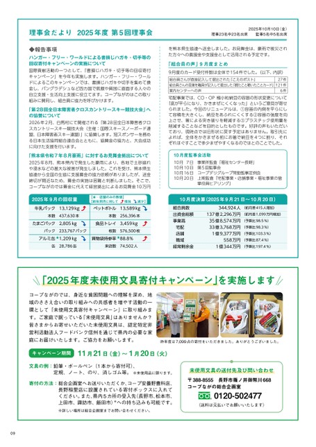 理事会だより2025年度第5回理事会理事23名中23名出席監事5名中5名出席2025年10月10日(金)◆報告事項ハンガー・フリー・ワールドによる書損じハガキ・切手等の回収寄付キャンペーンの実施について国際貢献活動の一つとして、「書損じハガキ・切手等の回収寄付キャンペーン」を今年も実施します。ハンガー・フリー・ワールドによるこのキャンペーンでは、書損じハガキや切手を集めて換金し、バングラデシュなど四カ国で飢餓や貧困に直面する人々の自立支援・生活向上支援に役立てます。コープながのはこの取り組みに賛同し、組合員に協力を呼びかけます。「第28回全日本障害者クロスカントリースキー競技大会」への協賛について2026年2月、白馬村にて開催される「第28回全日本障害者クロスカントリースキー競技大会(主催:国際スキースノーボード連盟、日本障害者スキー連盟)」に協賛します。冠スポンサーを務める日本生活協同組合連合会とともに、協賛金の協力と、大会成功に向けた支援を行います。「熊本県令和7年8月豪雨」に対するお見舞金拠出について2025年8月、熊本県内で発生した豪雨により、各地で土砂崩れや浸水などの甚大な被害が発生しました。これを受け、熊本県生協連から全国の生協に支援募金の協力依頼がありましたが、送金締切が間近なため、募金の実施は困難と判断しました。そこで、コープながのでは募金に代えて経営拠出によるお見舞金10万円2025年9月の回収量13,129kg437,630本2,805kg233,767パック1,209kg28,786缶牛乳パック本数たまごパックパックアルミ缶缶【★…店舗のみの数値】【前年同月に対して増加減少】ペットボトル本数食品トレイ枚数買物袋持参率来店数13,589kg256,396本3,459kg576,500枚88.8%74,502人を熊本県生協連へ送金しました。お見舞金は、豪雨で被災された方々への義援金や支援金として活用される予定です。「組合員の声」9月度まとめ9月度のカード受付件数は全体で154件でした。(以下、内訳)27件組合員さんが直接記入して提出された「こえのポスト」組合員さんの言葉を職員が記入して提出した「観たこと聴いたことカード」121件案内センターへの声6件宅配事業では、CO・OP極小粒納豆の容器の形状変更について「底が平らになり、かきまぜにくくなった」というご意見が寄せられました。今回のリニューアルは、①容器の内側を平らにして容積を大きくし、納豆をあふれにくくする②容器の強度を向上させ、箸による突き破りを軽減する③プラスチック使用量を削減することなどを目的としたものです。好評の声もいただいており、現時点では旧形状に戻す予定はありません。取引先によれば、全体をかきまぜる前にお箸で納豆を4つに割り、それぞれほぐすことで多少まぜやすくなるのではとのことでした。10月度監事会活動10月7日事業所監査「福祉センター長野」10月10日第5回監事会10月16日コープデリグループ常勤監事定例会10月20日上期監査「宅配事業・店舗事業・福祉事業の管掌役員ヒアリング」10月度決算(2025年9月21日~10月20日)344,924人(前月差415人増加)組合員数出資金総額事業高宅配店舗職域137億2,296万円(前月差1,099万円増加)35億8,574万円(予算比98.5%)33億3,768万円(予算比98.3%)1億9,377万円(予算比103.3%)558万円(予算比87.4%)経常剰余金1億344万円(予算比197.4%)「2025年度未使用文具寄付キャンペーン」を実施しますコープながのでは、身近な貧困問題への理解を深め、地域のささえ合いの取り組みへの共感者を増やす活動の一環として「未使用文具寄付キャンペーン」に取り組みます。ご家庭で眠っている「未使用文具」はありませんか?皆さまからお寄せいただいた未使用文具は、認定特定非営利活動法人フードバンク信州を通じて県内の必要な家庭にお届けいたします。ご協力をお願いします。昨年度は7,099点の寄付をいただきました。ありがとうございました。キャンペーン期間11月21日(金)~1月20日(火)文具の例:鉛筆・ボールペン(1本から寄付可)、定規、ノート、のり、消しゴム等。※未使用品に限ります。寄付の方法:総合企画室へお送りいただくか、コープ安曇野豊科店、長野稲里店に設置されている寄付ボックスに入れてください。また、県内5カ所の受入先(長野市、松本市、上田市、諏訪市、飯田市)※への持ち込みも可能です。※詳しい場所は総合企画室までお問い合わせください。未使用文具の送付先及び問い合わせ〒388-8555長野市篠ノ井御幣川668コープながの総合企画室0120-502477(送料は元払いでお願いいたします)09