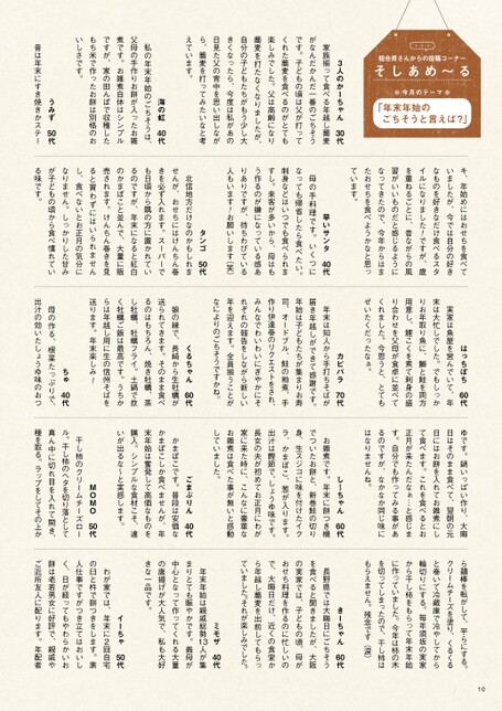 ・・・組合員さんからの投稿コーナーそしあめ〜る*今月のテーマ*「年末年始のごちそうと言えば?」3人のかーちゃん30代家族揃って食べる年越し蕎麦がなんだかんだ一番のごちそうです。子どもの頃は父が打ってくれた蕎麦を食べるのがとても楽しみでした。父は高齢になり蕎麦を打たなくなりましたが、自分の子どもたちがもう少し大きくなったら、今度は私があの日見た父の背中を思い出しながら、蕎麦を打ってみたいなと考えています。海の虹40代私の年末年始のごちそうは、父母の手作りお餅が入ったお雑煮です。お雑煮自体はシンプルですが、家の田んぼで収穫したもち米で作ったお餅は別格のおいしさです。0代昔は年末にすき焼きかステーうみず5キ、年始めにはおせちを食べていましたが、今では自分の好きなものを好きなだけ食べるスタイルになりました‼ですが、歳を重ねるごとに、昔ながらの風習がいいものだと感じるようになってきたので、今年からはまたおせちを食べようかなと思っています。早いサンタ40代母の手料理です。いくつになっても帰省したら食べたい。刺身などはいつでも食べられますし。来客が多いから、母はもう作るのが嫌になっている感ありありですが、待ちわびている人もいます‼お願いします(笑)タンゴ50代北信地方だけなのかもしれませんが、おせちにはけんちん巻きを必ず入れます。スーパーでも日頃から隅の方に置かれているのですが、年末になると紅白のかまぼこと並んで、大量に販売されます。けんちん巻きを見ると買わずにはいられませんし、食べないとお正月の気分になりません。しっかりした甘みが子どもの頃から食べ慣れている味です。はっちぽち60代実家は魚屋を営んでいて、年末は大忙しでした。でもしっかりお年取り魚に、鰤と鮭を両方用意し、鯉こくを煮て刺身の盛り合わせを父母が食卓に並べてくれました。今思うと、とてもぜいたくだったなぁ。0代年末は知人から手打ちそばがカピパラ7届き年越しができて感謝です。年始は子どもたちが集まりお寿司、オードブル、鮭の粕煮、手作り伊達巻のリクエストをされ、みんなでわいわいにぎやかにそれぞれの報告をしながら新しい年を迎えます。全員揃うことがなによりのごちそうですかね。くるちゃん60代娘の縁で、長崎から生牡蠣が送られてきます。そのまま食べるのはもちろん、焼き牡蠣、蒸し牡蠣、牡蠣フライ。土鍋で炊く牡蠣ご飯は最高です。うちからは年越し用に生の信州そばを送ります。年末楽しみ!ちゅ40代母の作る、根菜たっぷりで、出汁の効いたしょうゆ味のおつゆです。鍋いっぱい作り、大晦日はそのまま食べて、翌朝の元日にはお餅を入れてお雑煮にして食べます。これを食べるとお正月が来たんだなぁ…と感じます。自分でも作ってみる事があるのですが、なかなか同じ味にはなりませんね。し~ちゃん60代お雑煮です。年末に餅つき機でついたお餅と、新巻鮭の切り身、生スジコに味を付けたイクラ、かまぼこ、葱が入ります。出汁は鰹節で、しょうゆ味です。長女の夫が初めてお正月にわが家に来た時に、こんなに豪華なお雑煮は食べた事が無いと感動していました。ごまぷりん40代かまぼこです。普段は安価なかまぼこしか食べませんが、年末年始は奮発して高価なものを購入。シンプルな食材こそ、違いが出るな〜と実感します。MOMO50代干し柿のクリームチーズロール。干し柿のヘタを切り落として真ん中に切れ目を入れて開き、種を取る。ラップをしてその上か10ら麺棒を転がして、平らにする。クリームチーズを塗り、くるくると巻いて冷蔵庫で冷やしてから輪切りにする。毎年須坂の実家から干し柿をもらって年末年始に作っていました。今年は柿の木を切ってしまったので、干し柿はもらえません。残念です(涙)きーちゃん60代長野県では大晦日にごちそうを食べると聞きましたが、大阪の実家では、子どもの頃、母がおせち料理を作るのに忙しいので、大晦日だけ、近くの食堂から年越し蕎麦を出前してもらっていました。それが楽しみでした。ミモザ4年末年始は親戚総勢10代3人が集まりとても賑やかです。義母が中心となって作ってくれる大量の唐揚げが大人気で、私も大好きな一品です。イーちゃ50代わが家では、年末に2回自宅の臼と杵で餅つきをします。素人仕事ですがつき立てはおいしく、日が経ってもやわらかいお餅は老若男女に好評で、親戚やご近所友人に配ります。年配者