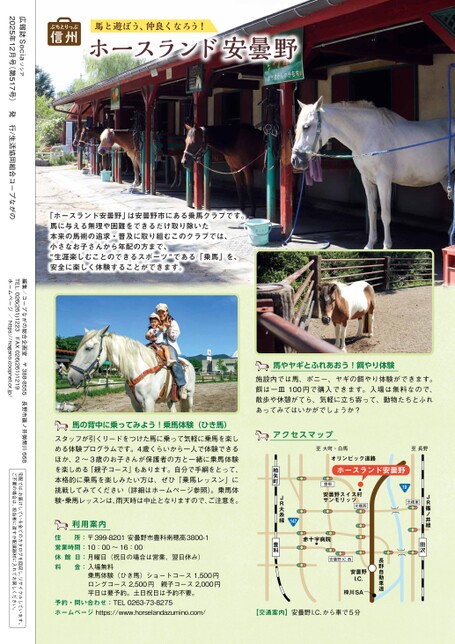 馬やヤギとふれあおう!餌やり体験施設内では馬、ポニー、ヤギの餌やり体験ができます。餌は一皿100円で購入できます。入場は無料なので、散歩や休憩がてら、気軽に立ち寄って、動物たちとふれあってみてはいかがでしょうか?至大町・白馬至長野オリンピック道路ホースランド安曇野JR篠ノ井線19光橋東田沢重柳安曇野スイス村サンモリッツ光橋西赤十字病院147JR大糸線柏矢町豊科アクセスマップ長野自動車道安曇野IC西安曇野I.C.梓川SA【交通案内】安曇野I.C.から車で5分馬の背中に乗ってみよう!乗馬体験(ひき馬)スタッフが引くリードをつけた馬に乗って気軽に乗馬を楽しめる体験プログラムです。4歳くらいから一人で体験できるほか、2~3歳のお子さんが保護者の方と一緒に乗馬体験を楽しめる「親子コース」もあります。自分で手綱をとって、本格的に乗馬を楽しみたい方は、ぜひ「乗馬レッスン」に挑戦してみてください(詳細はホームページ参照)。乗馬体験・乗馬レッスンは、雨天時は中止となりますので、ご注意を。利用案内住所:〒399-8201安曇野市豊科南穂高3800-1営業時間:10:00~16:00休館日:月曜日(祝日の場合は営業、翌日休み)料金:入場無料乗馬体験(ひき馬)ショートコース1,500円ロングコース2,500円親子コース2,000円平日は要予約。土日祝日は予約不要。予約・問い合わせ:TEL0263-73-8275ホームページhttps://www.horselandazumino.com/ぷちとりっぷ信州馬と遊ぼう、仲良くなろう!ホースランド安曇野「ホースランド安曇野」は安曇野市にある乗馬クラブです。馬に与える無理や困難をできるだけ取り除いた本来の馬術の追求・普及に取り組むこのクラブでは、小さなお子さんから年配の方まで、“生涯楽しむことのできるスポーツ”である「乗馬」を、安全に楽しく体験することができます。広報誌Sociaソシア2025年12月号(第517号)発行/生活協同組合コープながの編集/コープながの総合企画室〒388-8555長野市篠ノ井御幣川668TEL.026(261)1223FAX026(261)1219ホームページ/https://nagano.coopnet.or.jp/宅配では、お届けしている全てのカタログを回収し、リサイクルしています。ご不要の場合は、担当者に渡すか配達器材に入れてお戻しください。